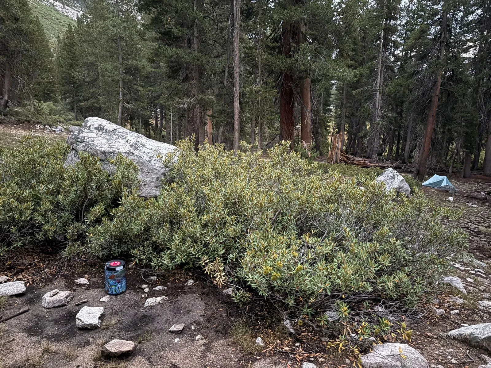 Once I reached the valley floor, the rain had subsided enough that I was able to take a break and give my gear a chance to dry out a bit. I eventually reached Big Pete Meadow around dusk. I set up camp in a nice sheltered grove, cooked dinner, and went to bed around 8:00PM. It rained and hailed heavily throughout the night, with thunder and lightning hitting the surrounding mountains. I slept well despite the weather, staying warm and dry.