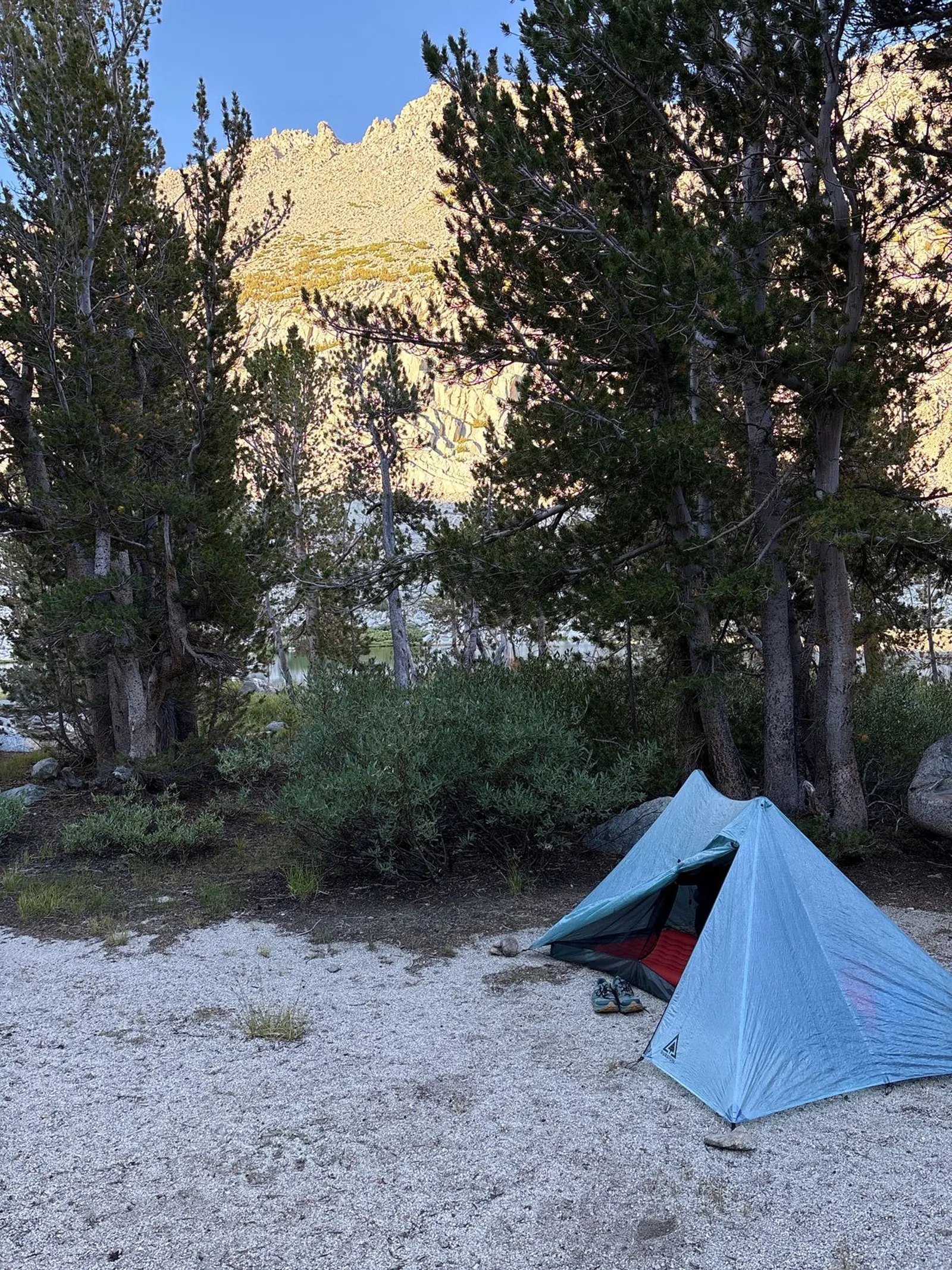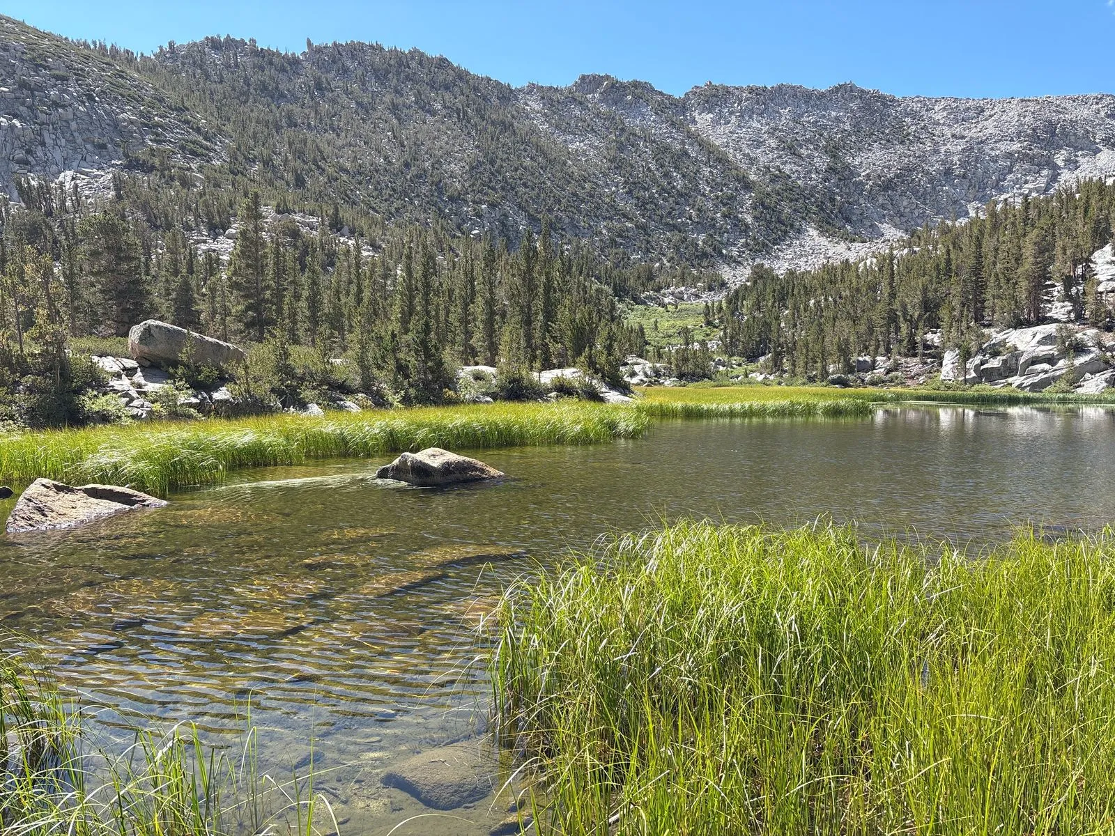 I passed Evolution Lake and made my final descent for the day into Darwin Meadow, where I was planning to camp. However, when I arrived there, I saw probably more than a dozen tents already set up. It was summer thru-hiking season after all. As it was still late afternoon, I decided to continue on for another mile or two to the much quieter McClure Meadow, where I set up camp a few hundred yards from the ranger’s cabin.