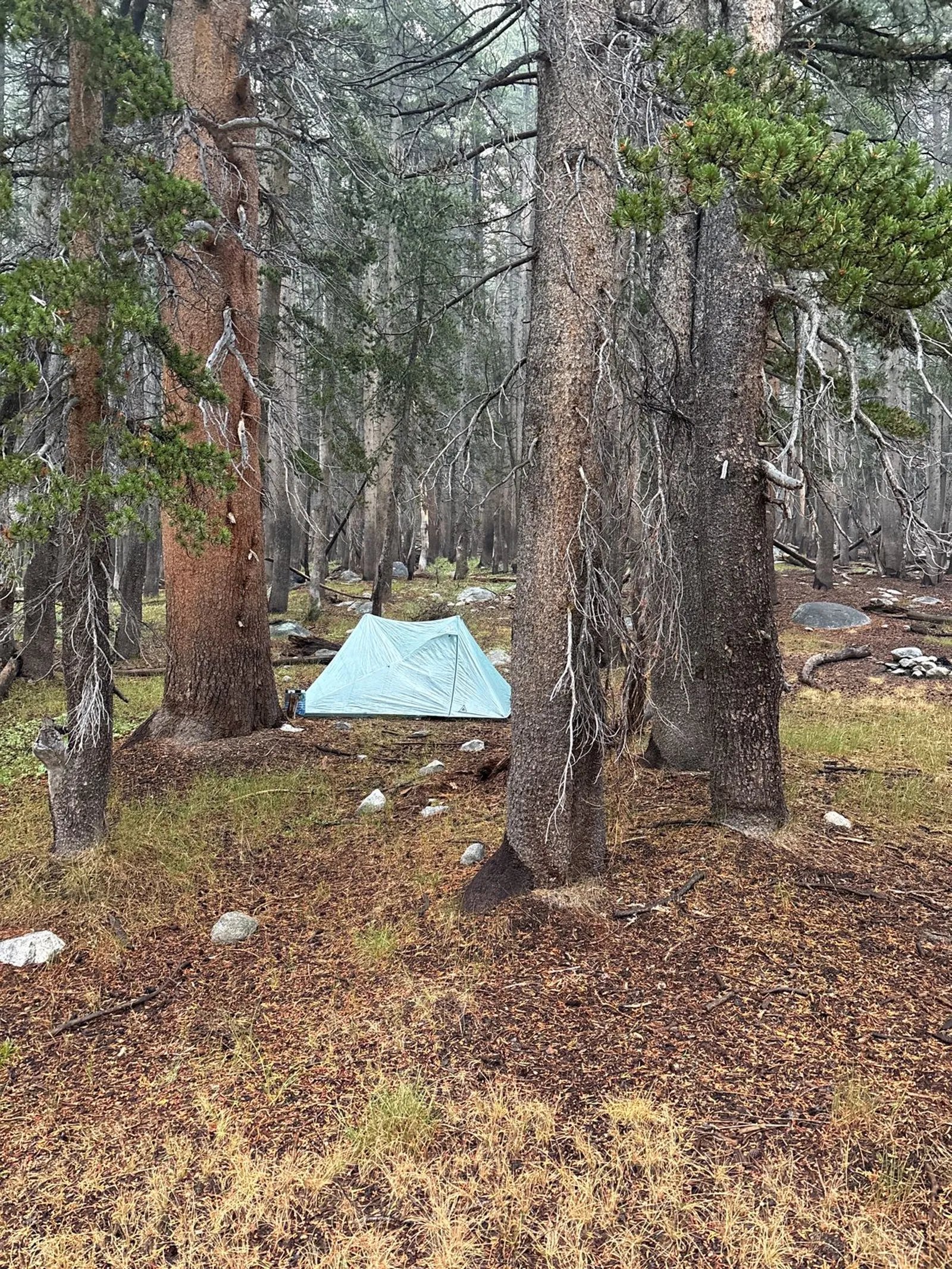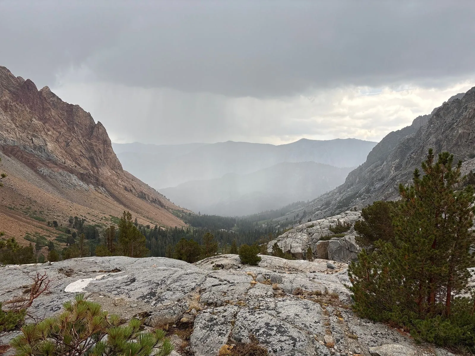 I make several mistakes on every single trip, and this one was no exception. Although I had packed a rain jacket and pants, I neglected to do my usual persnickety product research. I was used to Sierra Nevada summer storms being sporadic and brief, so I assumed that my relatively inexpensive REI rain gear would suffice. Unfortunately not. After about 20 minutes in the rain it had completely soaked through.