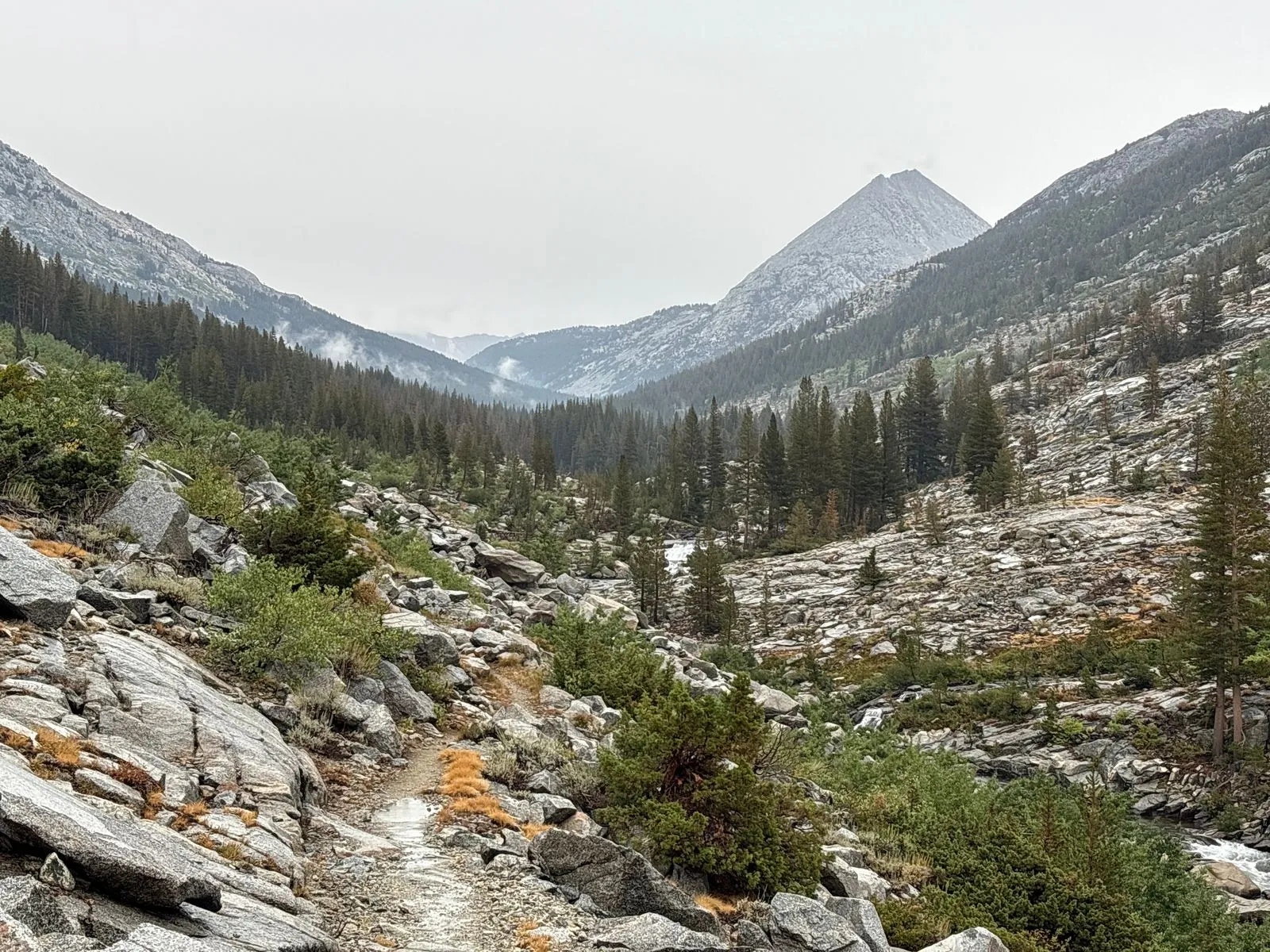 I descended into the Dusy Basin and continued my eastward descent to the middle fork of the Kings River and the John Muir Trail, both at the bottom of the valley over 2,000 ft below. The views of the valley and surrounding mountains were incredible despite the dreary day. The Dusy Branch creek flowed alongside the trail down a massive slab of granite several hundred feet wide.
