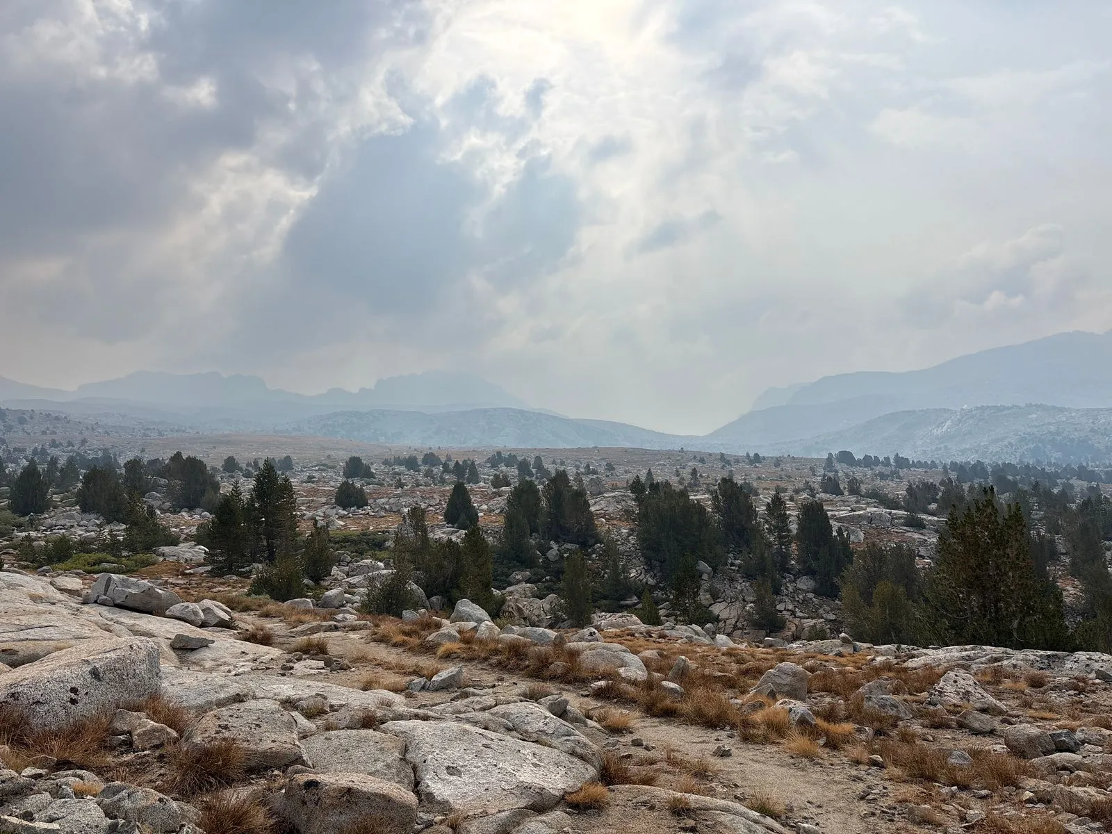 The next morning I got a fairly early start. The weather was still drizzly and overcast. After a few miles the trail split in two, with a south fork going close to the Golden Trout Lakes, and the north fork traversing the ridge a couple of miles away. Both trails headed towards Paiute Pass to the east. I chose the north fork for the views, though I was a bit worried about the water situation. I needn’t have been; there were several springs along the way, and that section of the trail was one of the most beautiful of the entire trip. The photos don’t quite do it justice. The massive open expanse, with towering granite peaks the south and the Golden Trout Lakes in view in the distance, were really a sight to behold. It was here that I sent a quick Happy Birthday satellite text to a good friend’s son. Yay technology.